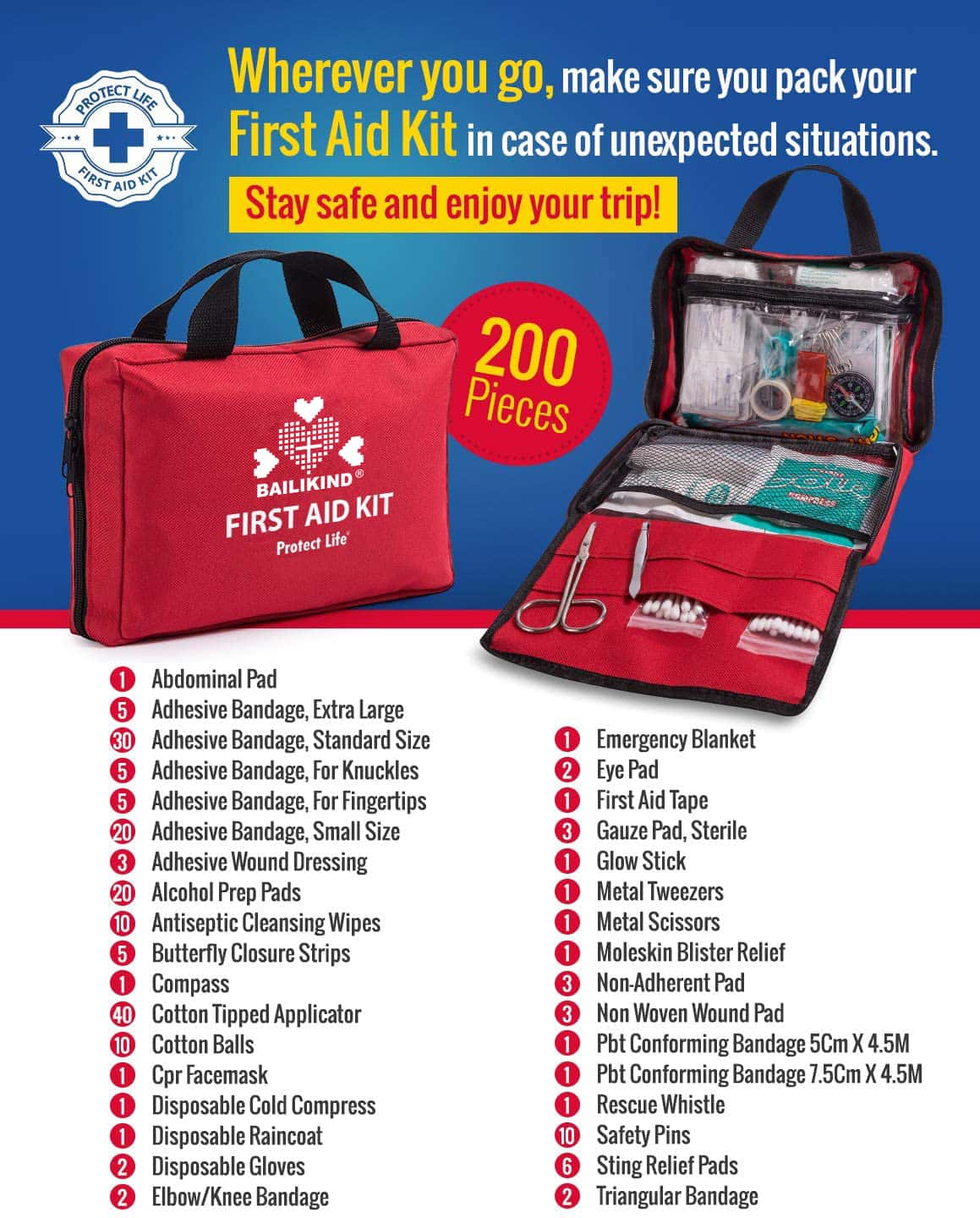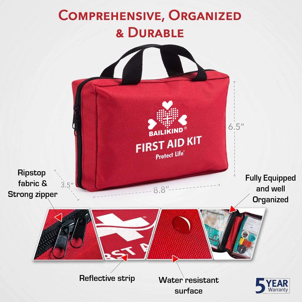 DURABLE RIPSTOP MATERIAL (8.8" x 6.5" x 3.5", weighs only 1.4 pounds). Strong, compact and easy to carry, yet holds all the basic first aid and preparedness items (200 pieces total). It is well-organized in multiple compartments and there is still additional space to add more personal items.