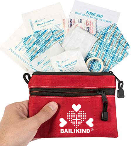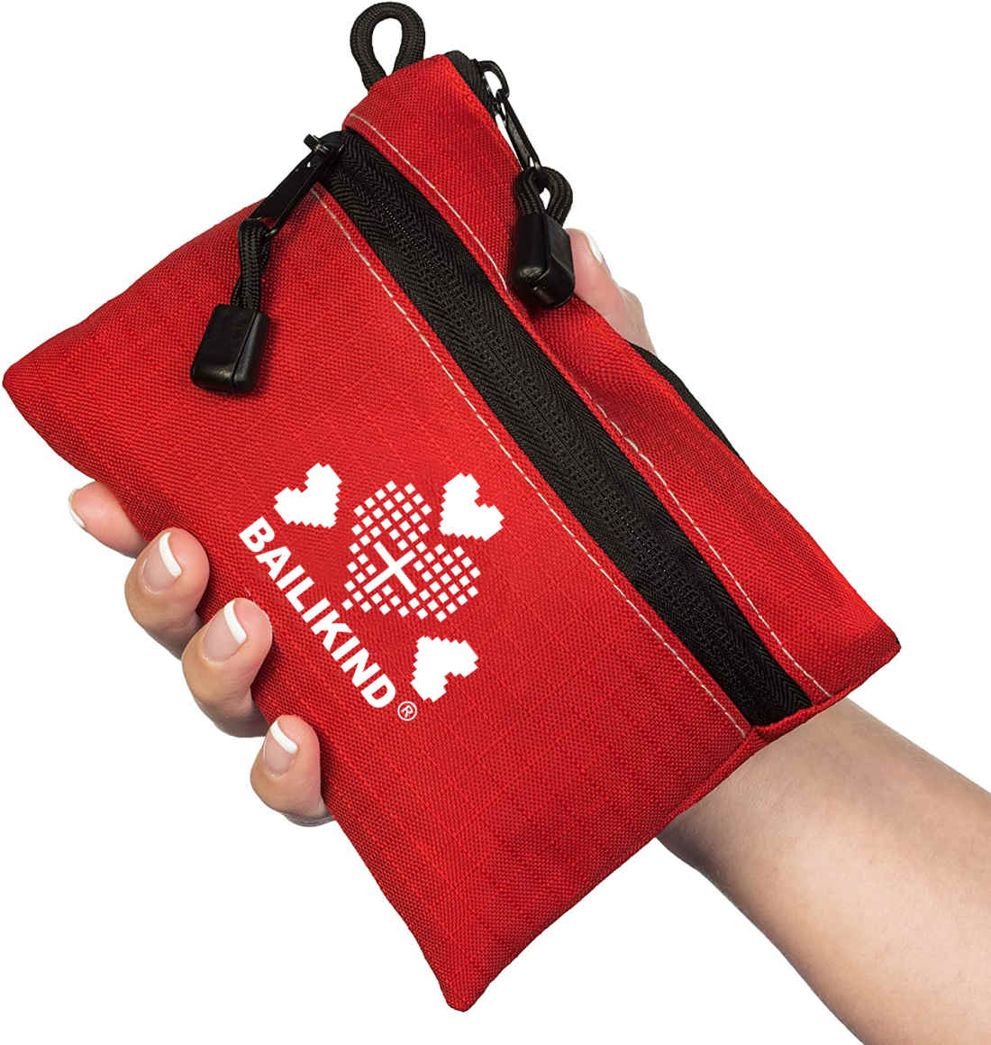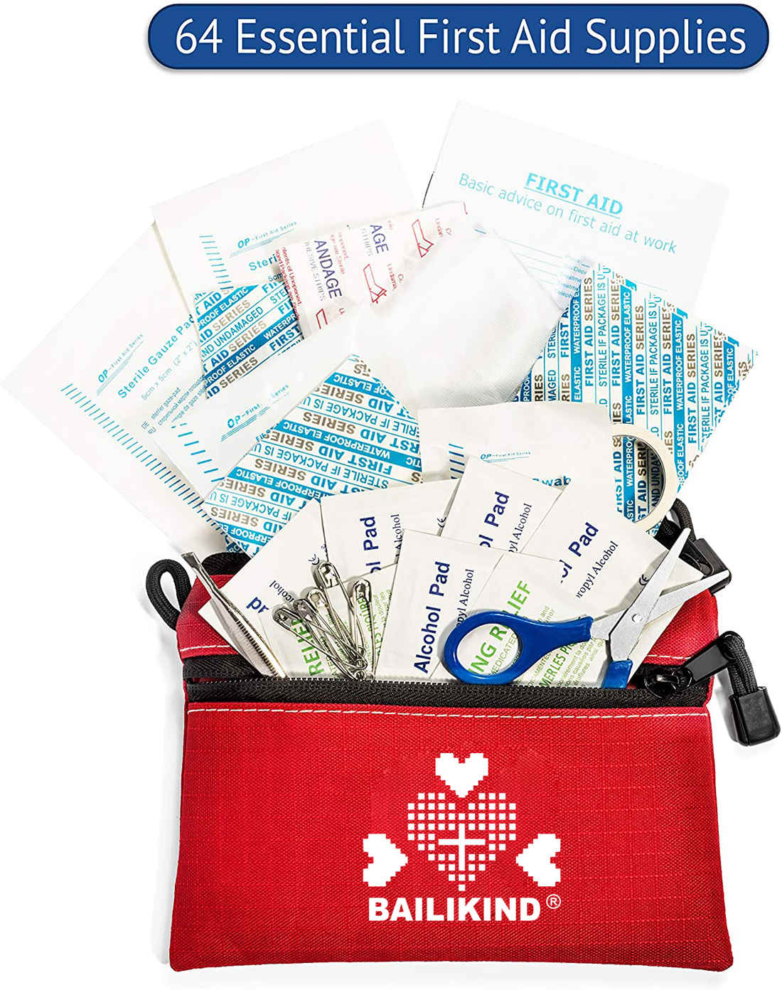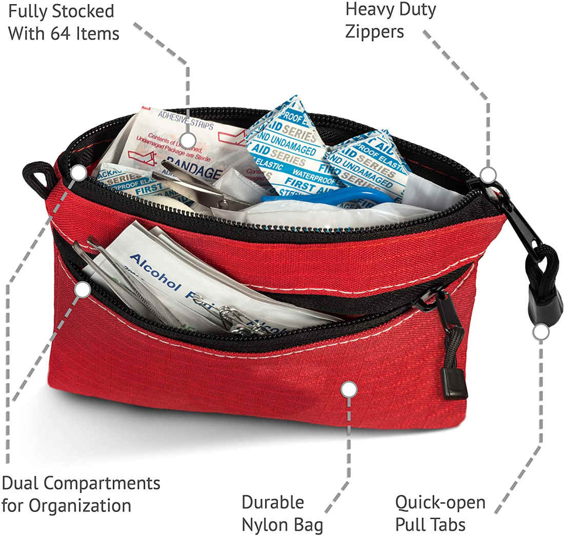Red First Aid Pocket with double zipper perfectly in your hand, pocket, or travel bag (6.5" x 4.5"). There are 64-Piece Kit offers better organization & extra room for more medical items.