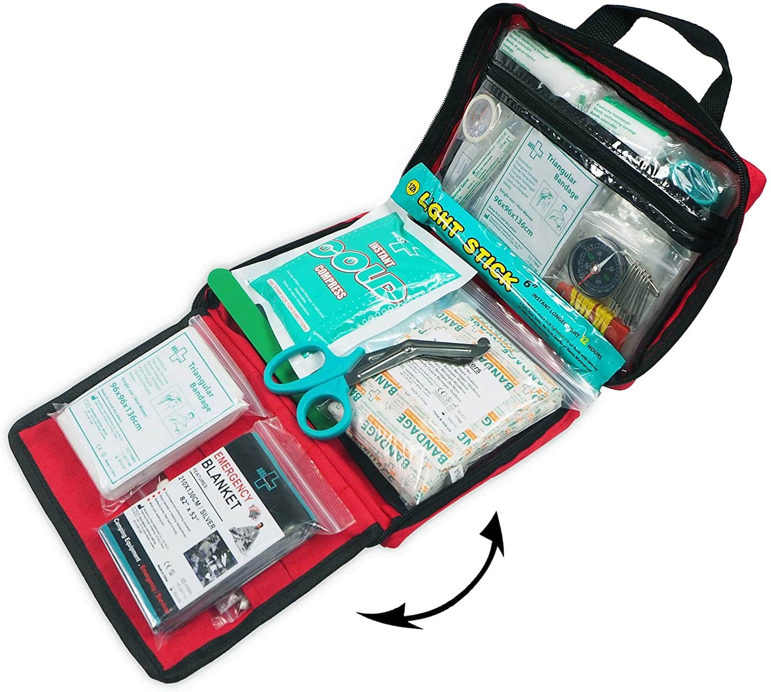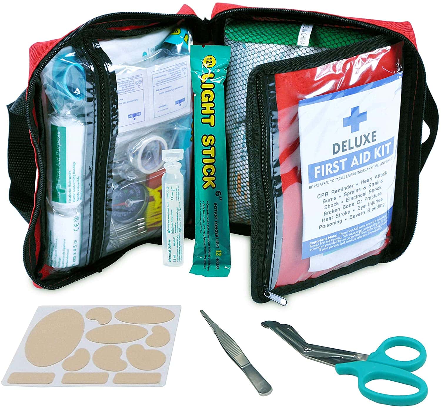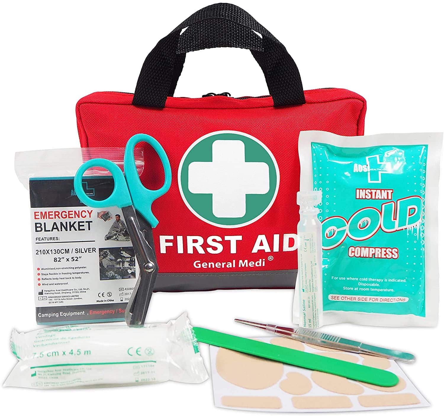 Feature of Red Polyester First Aid Bag: Each inner sleeve is organized by category. During times of need, get to right items quickly. After items are used, easily see what needs to be replaced.This comprehensive kit is including Instant cold packs, scissors, plaster, Emergency blanket, moleskin pad and more to treat most minor illnesses and injuries.