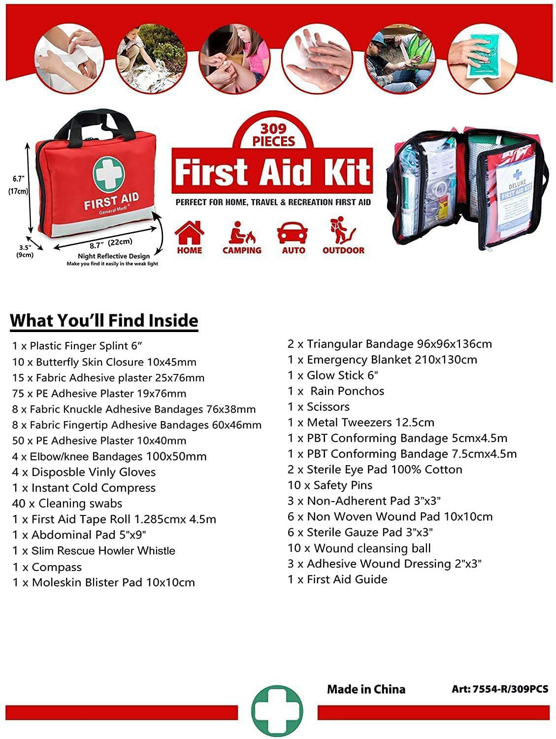 | Contains | Packed with 309 useful and valuable hospital grade first aid supplies |